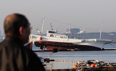 Orang ramai menyaksikan kerosakkan yang berlaku selepas Tsunami di Kesennuma ,Wilayah Miyagi, Jepun utara
